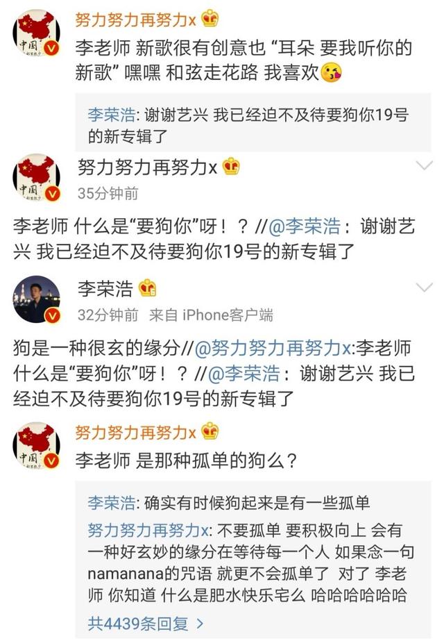 李荣浩:谢谢艺兴,我已经迫不及待要狗你19号的新专辑了。