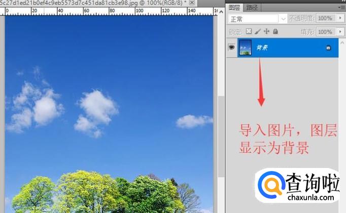 首先我们打开PhotoShop软件,导入一张背景图片,如下图所示,你会看到图层 显示为背景图层,这代表着当前图层是锁定,并且不能编辑的。