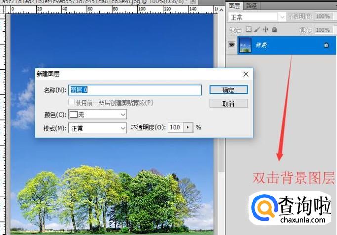 接下来我么双击背景图层,会弹出新建图层界面,我们只需要点击确定即可,如下图所示。