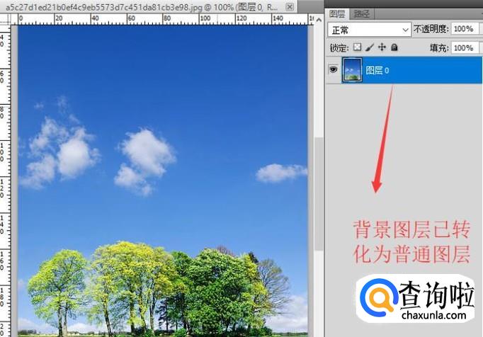这个时候回到PhotoShop界面中你就会发现远背景图层已经变成了普通的图层,并且右边的锁也没了,如下图所示。