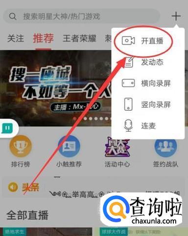 进入之后,点击图示位置的“+”选择“开直播”,进入下一页面,如图所示。