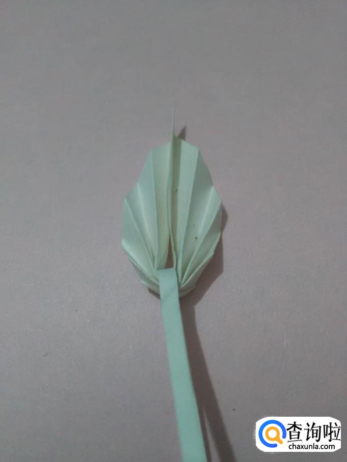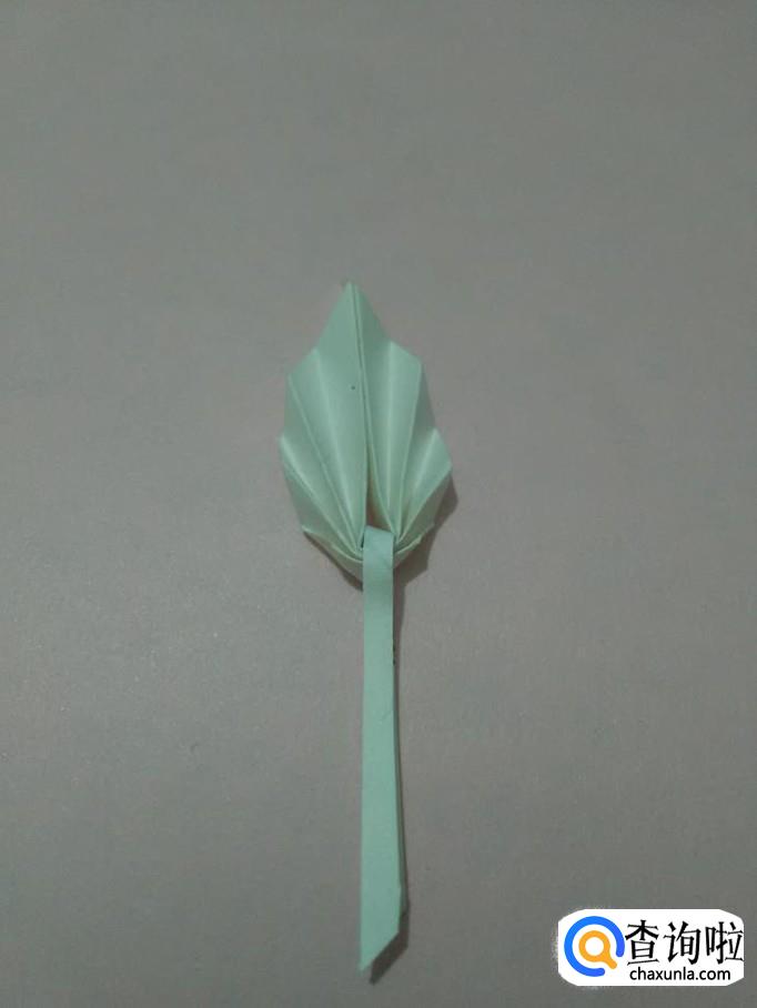 把小纸条从折好的纸中间穿过,两端用胶棒粘好,上方的叶子部分也用胶棒粘好,一片好看的叶子就折好了。