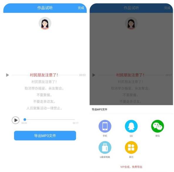 4、试听完成后,保存音频至手机、微信等位置,还可以将其生成的MP3文件拷贝到U盘或内存卡中。