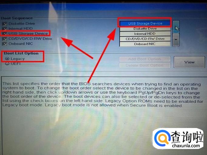 勾选“USB Storage Device ”选项,点击“向上箭头”键将USB Storage Device 置于第一启动项;