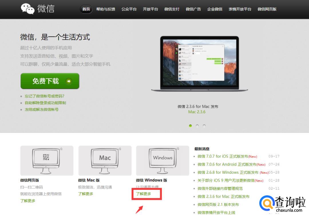 在微信官网中,选择适合你电脑的版本,此处以Windows版为例,点击微信 Windows 版下的“了解更多”。