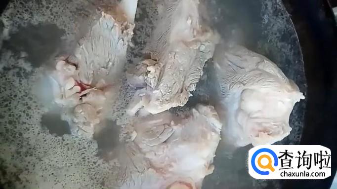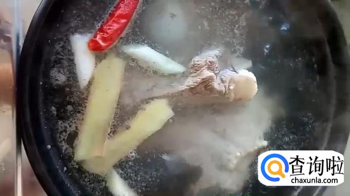 在锅中放水,冷水时将大骨头放入水中焯水,煮出猪骨头的血沫后,捞出备用。