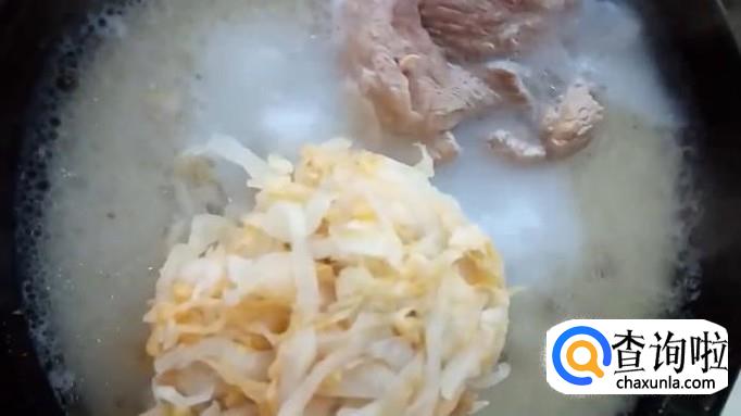煮好后,取500g酸菜,将酸菜放入沙锅中,小火炖20分钟。