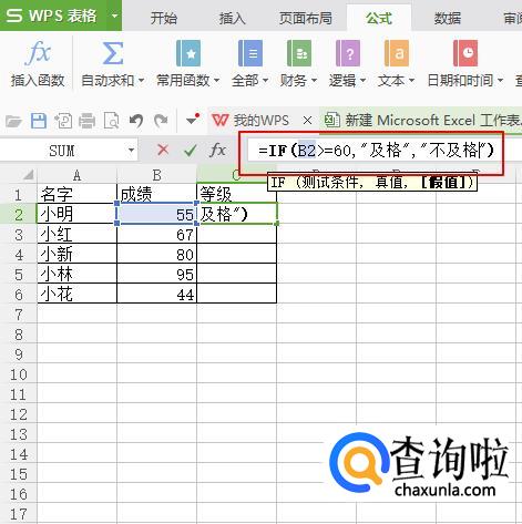 此时我们输入:=IF(B2>=60,"及格","不及格"),然后按“Enter”键,可以看到出来了第一个学生的判定结果。这里公式表示的含义为:学生成绩大于等于60分出来的判定结果为“及格”,如果小于60分则判定为不及格。