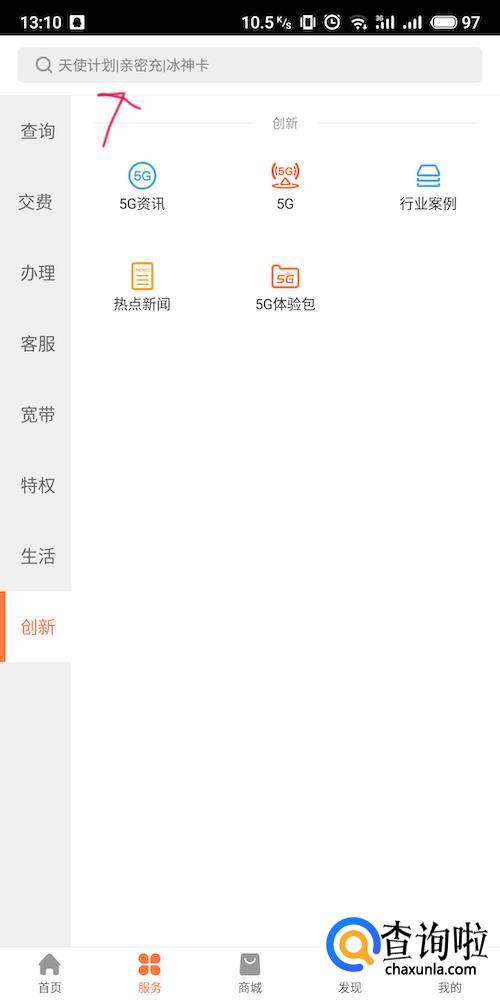 进入服务界面,点击上方导航栏中的搜索条,进入搜索界面。
