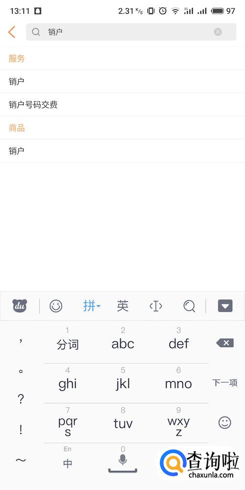 在搜索界面中,我们输入“销户”进行搜索,然后在下方服务中点击“销户”,因为这个功能现在在一级页面是已经隐藏了的,所以只能靠搜索找到。