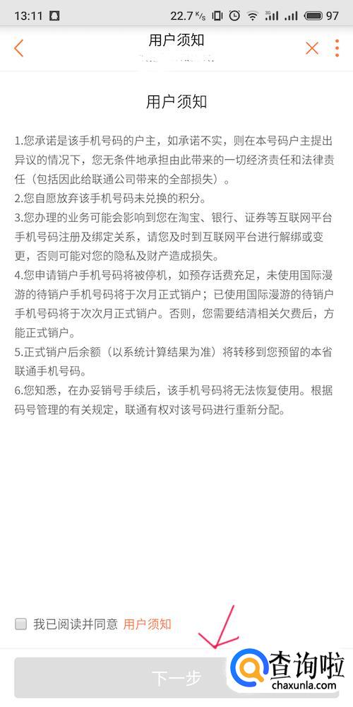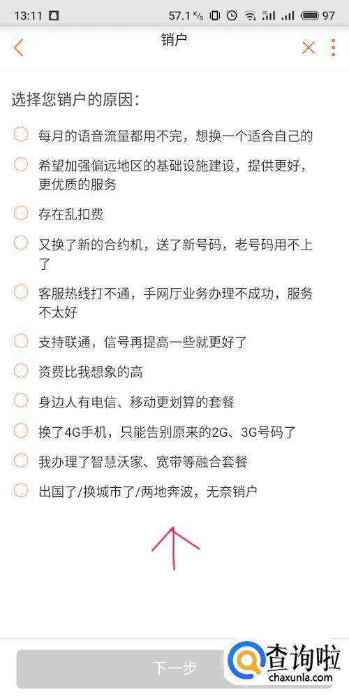 登录完成之后,根据系统提示,在上方选项中选择您的销户原因,选择之后点击下方“下一步”