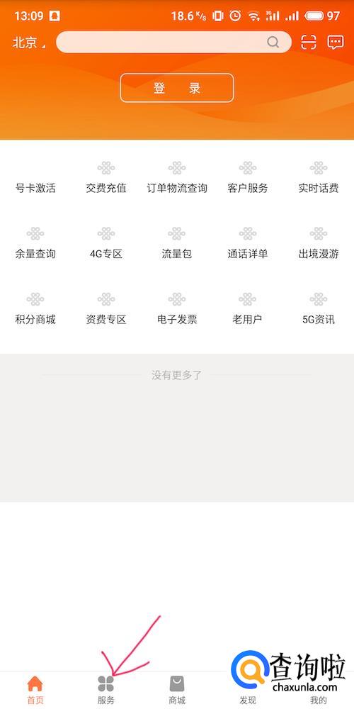进入中国联通APP首页,在下方导航栏中选择“服务”