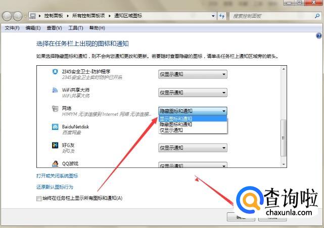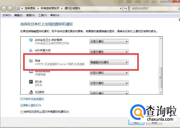 点击“自定义”。可以看到网络这一项,果然处于“隐藏图标和通知”状态。
