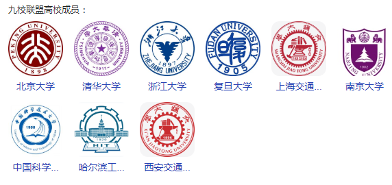 九校联盟(C9),包括北京大学、清华大学、复旦大学、上海交通大学、南京大学、浙江大学、中国科学技术大学、哈尔滨工业大学、西安交通大学共9所高校。