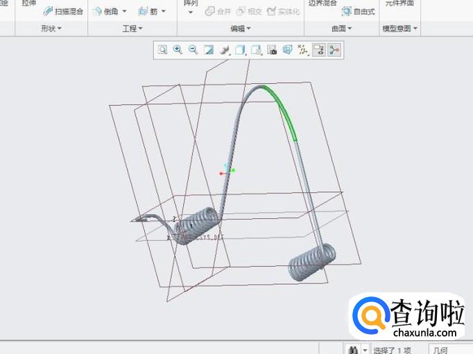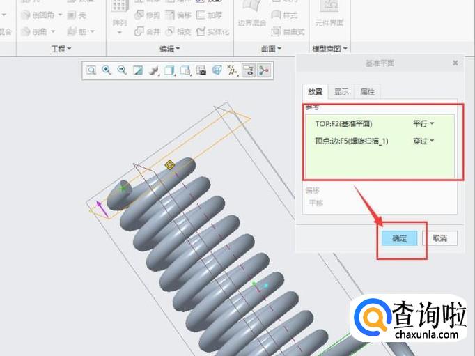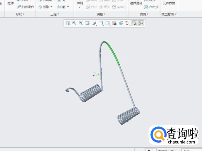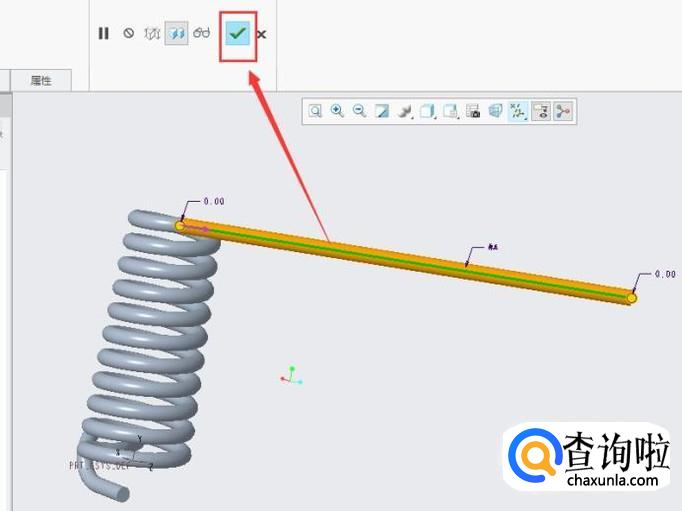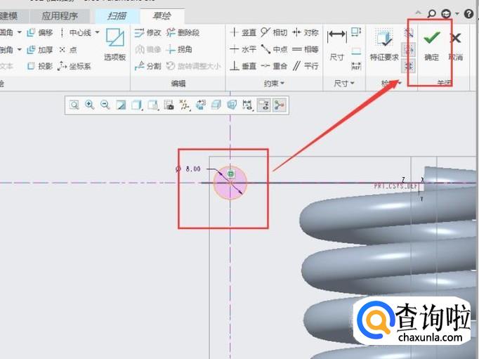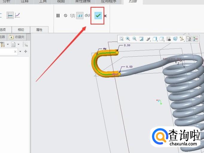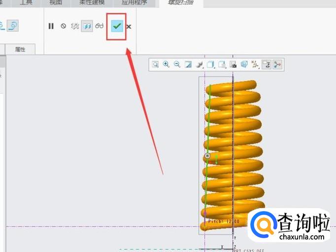 回到“螺旋扫描”界面,点击“绿色对勾”即可完成弹簧的螺旋部分,如图所示。