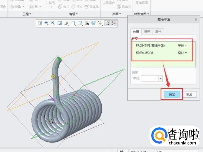 点击“面”,以草绘线的端点和FRONT面为基准创建一个面,如图所示。