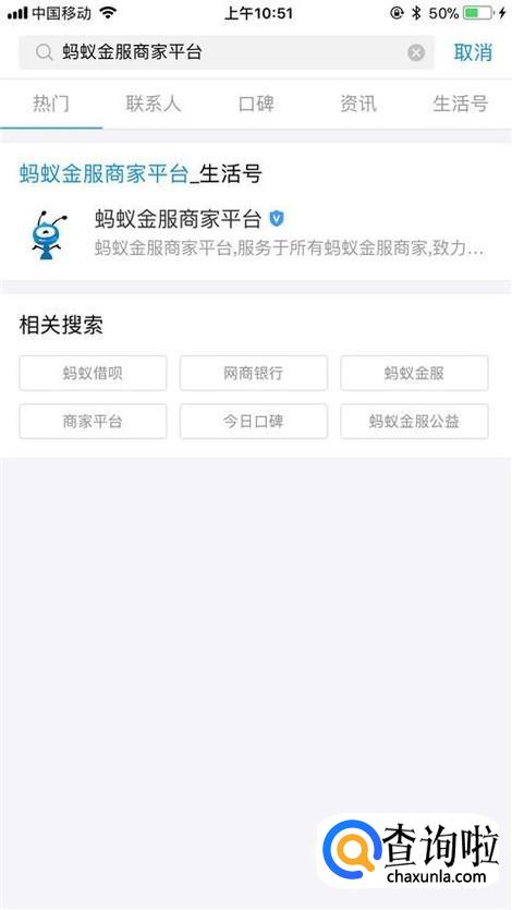 然后点击蚂蚁金服商家平台生活号,如下图所示。