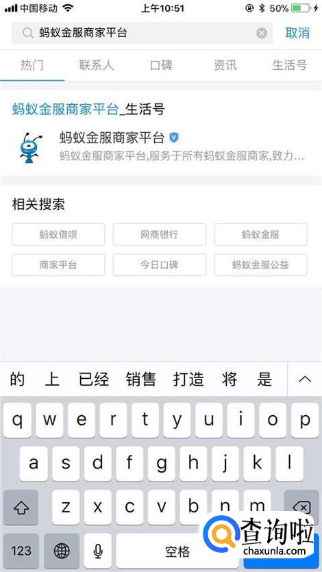 首先在支付宝app中输入蚂蚁金服商家平台并点击搜索,如下图所示。