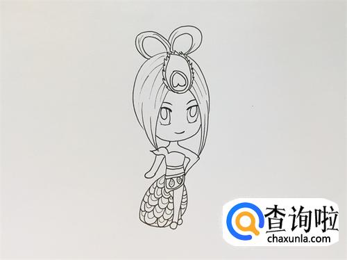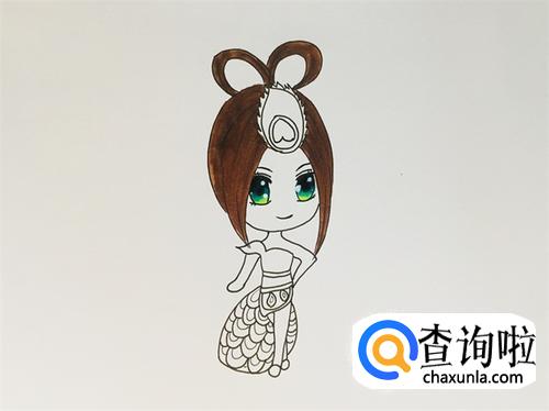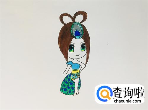 给裙子画上孔雀花纹,把头发的细节部分也添加上。