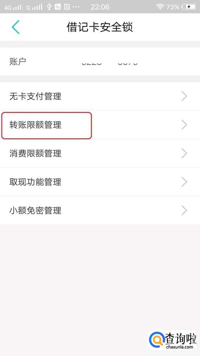 我们看到,可以对借记卡账户进行如下图所示的多项管理,我们点击“转账限额管理”(消费限额设置方法相同)。