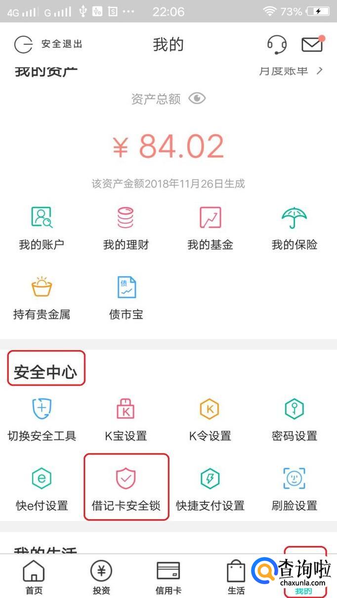 登录之后,回到首页,点击右下角“我的”,进入个人页。我们点击安全中心下面的“借记卡安全锁”。