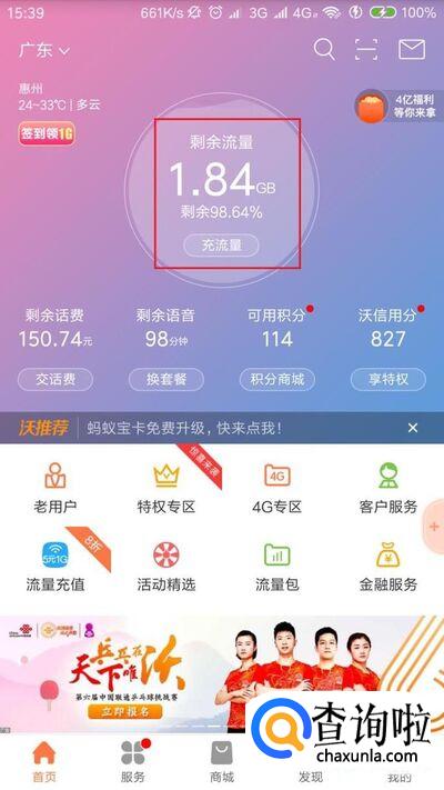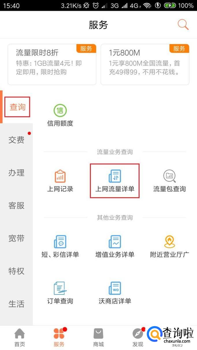 除此之外,还可以点击页面底部的“服务-查询”菜单按钮,在页面中选择“上网流量详情”菜单按钮。