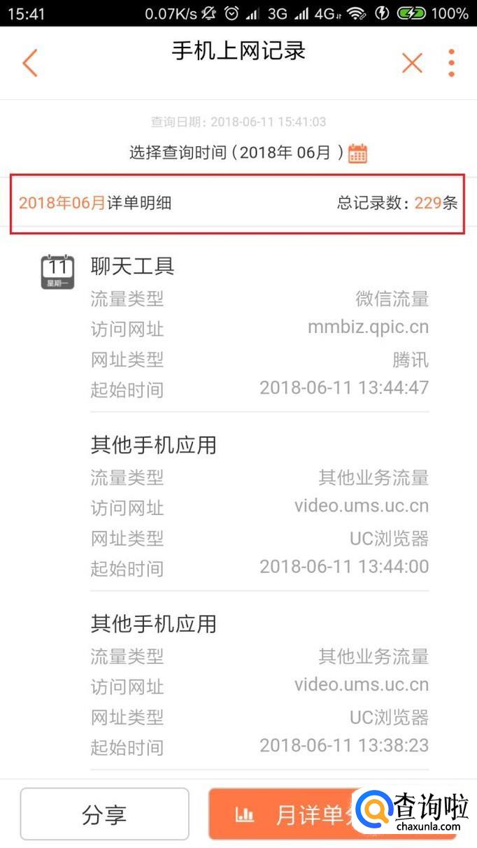 最后,就可以在页面中看到自己当前的流量使用记录以及上网记录等信息了。