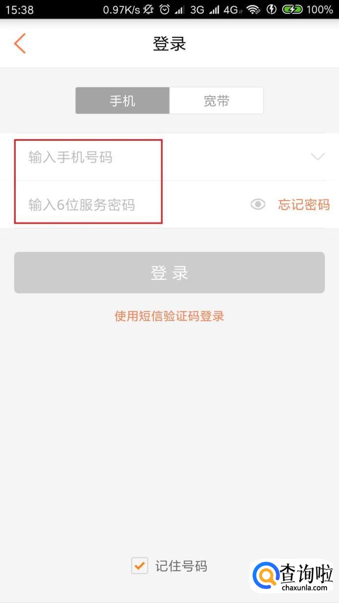 这里以中国联通手机营业厅APP为例,打开APP页面之后,使用手机号码和服务密码登录。