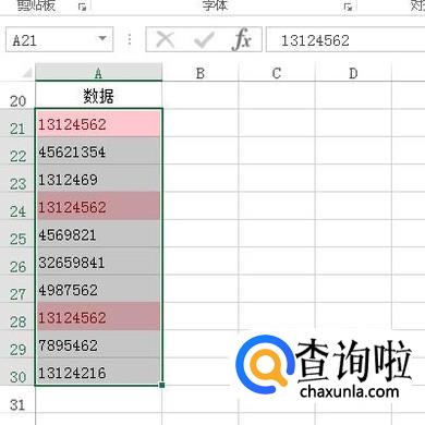 对话框关闭,再看数据区域,呈红色的数据就是重复数据。