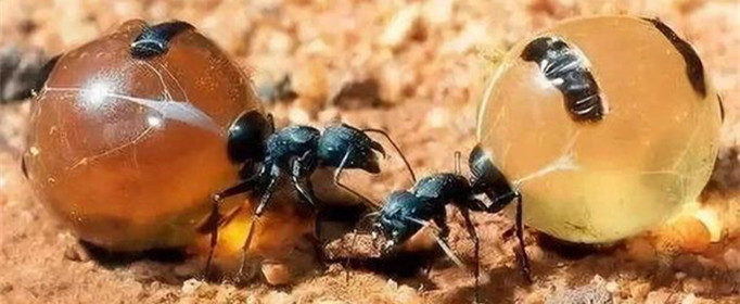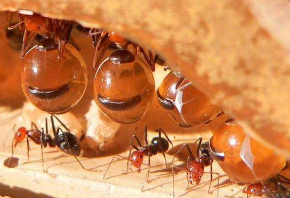 蜜蚁中的工蚁称为贮蜜蚁,终身生活在地下,倒挂在蚁穴之中,它们的肚子就是贮藏室。雨季,它们的肚子内装满花蜜,胀得就像一只只气球一样。干旱季节,它们排出食物,帮助蚁群度过难关。
