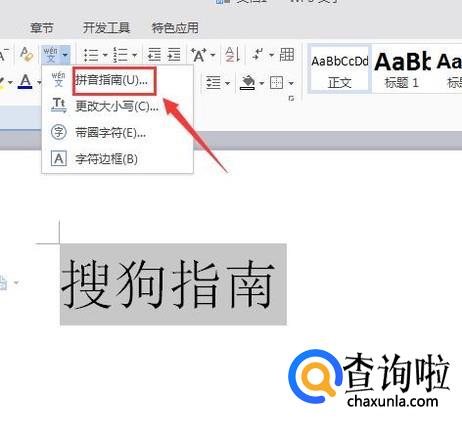 点击拼音指南后的下拉箭头在其内找到拼音指南选项,如图所示: