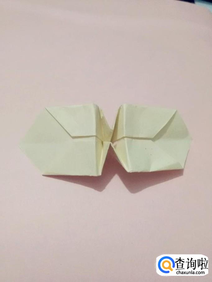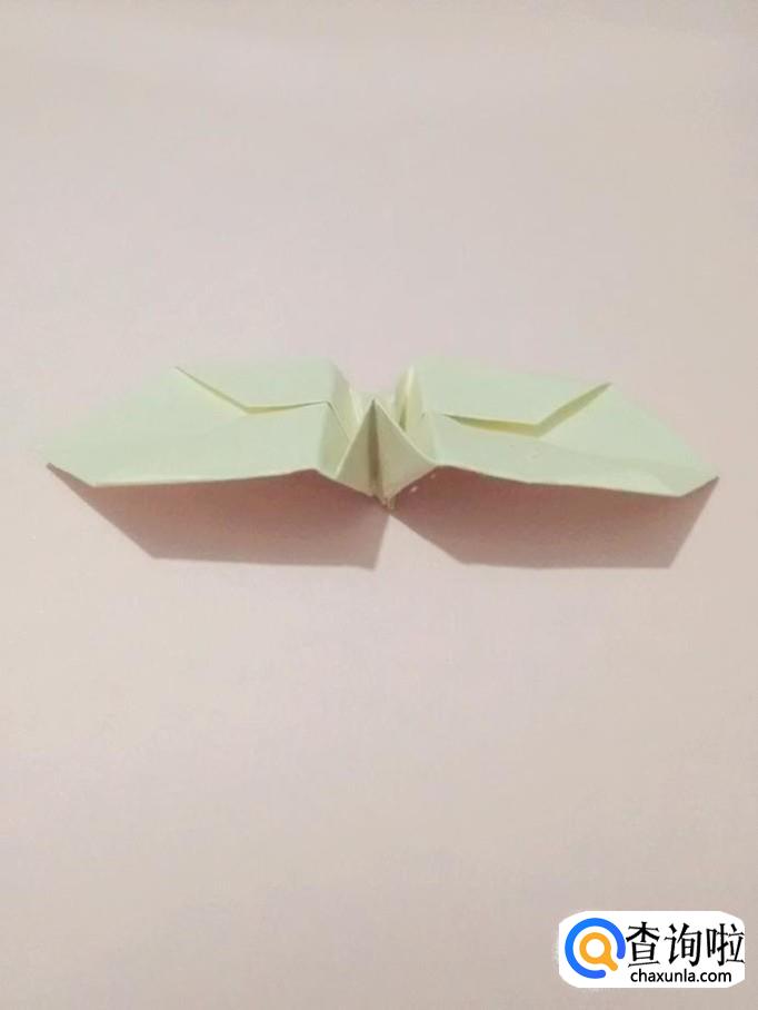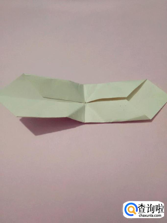 把中间的两条线往里折,把中间部分收进去,两边的部分往两侧分开,压平,旋转的蜻蜓就折完了。