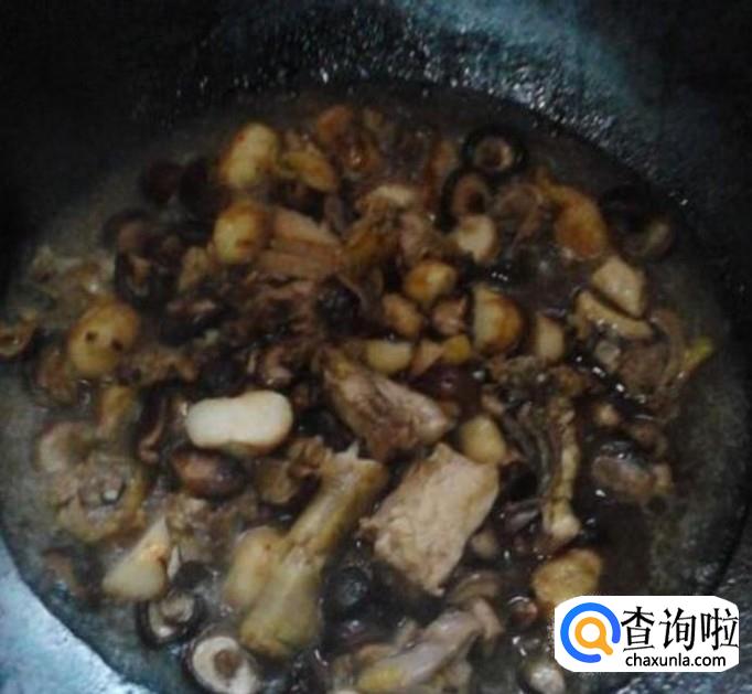 把香菇炒好后就可以放入刚刚去掉血水的鸡肉,等待鸡肉有了辅料的颜色后就可以倒入适量的开水。