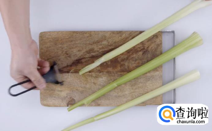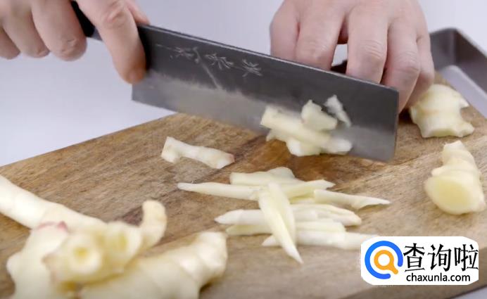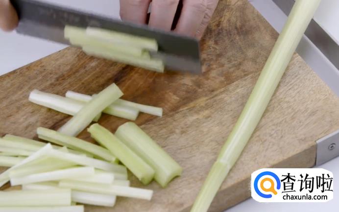 接着,将子姜掰成小块,然后切成细条。再把西芹表皮上的筋膜刮去,也切成细条。