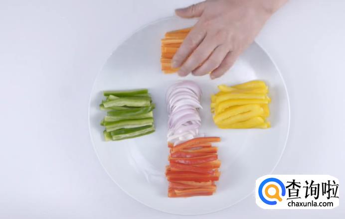 然后,把洋葱、甜椒和胡萝卜都切成条,放在盘中备用。