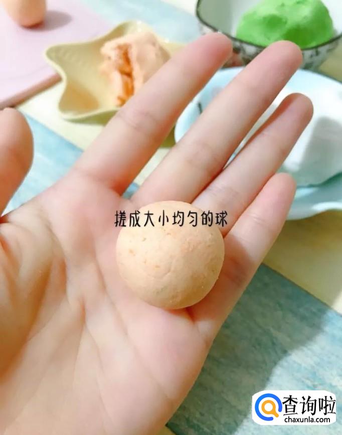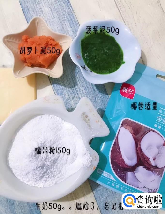 食材:胡萝卜泥50克,菠菜泥50克,椰蓉适量糯米粉150克,牛奶50克。