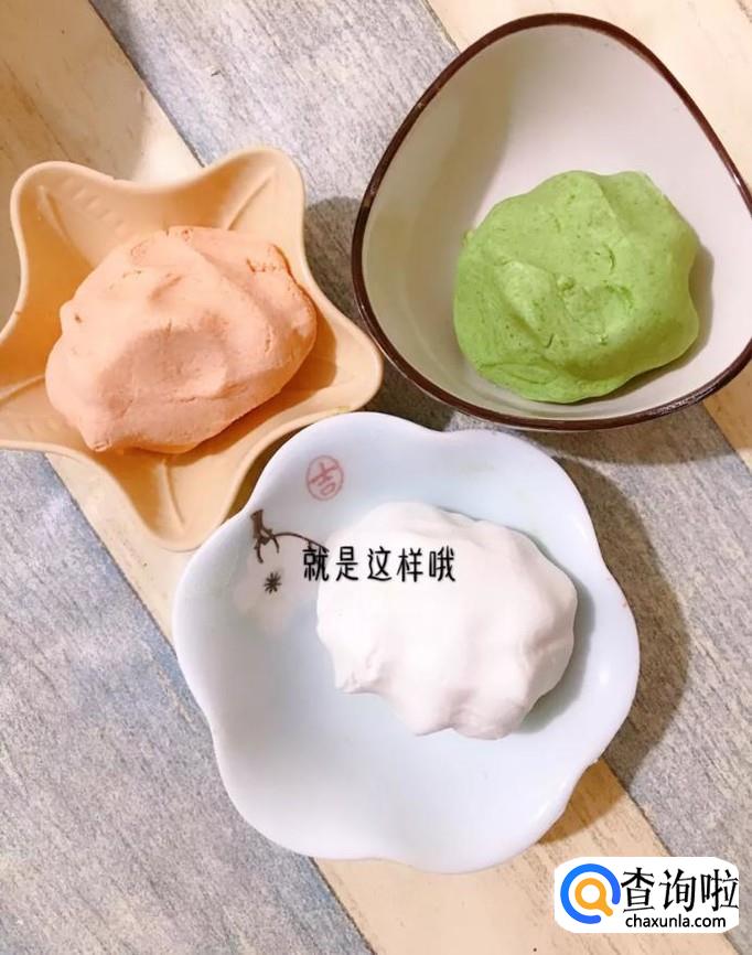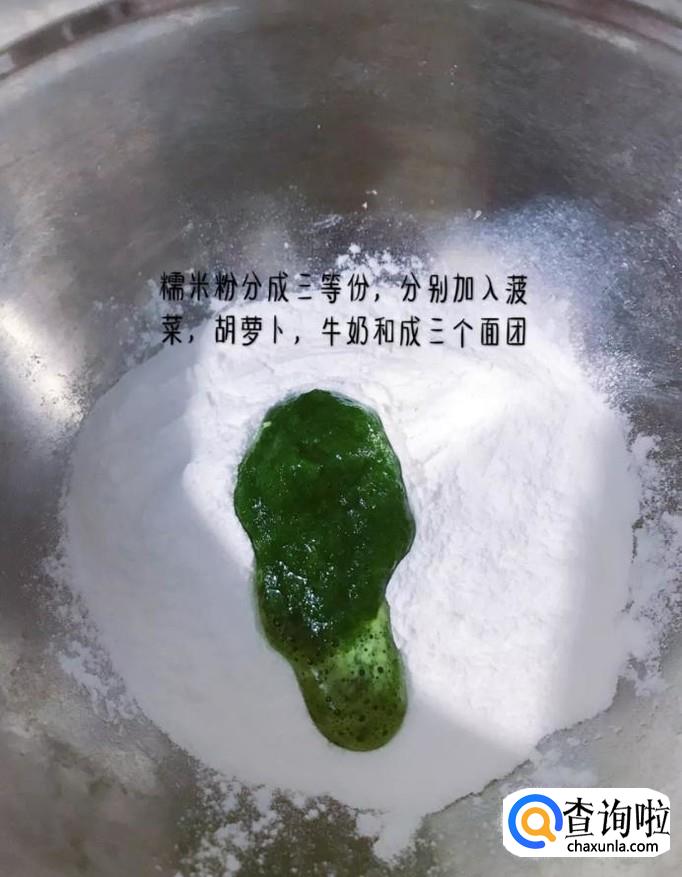 首先将糯米粉分成三等份,分别加入菠菜泥、胡萝卜泥和牛奶,如下图所示。