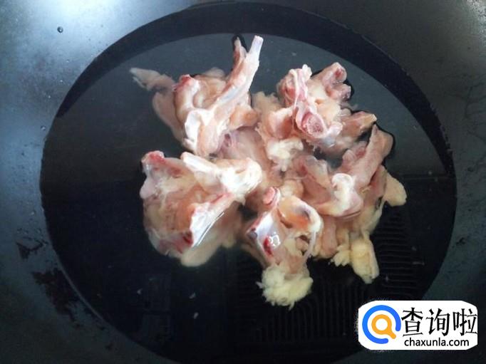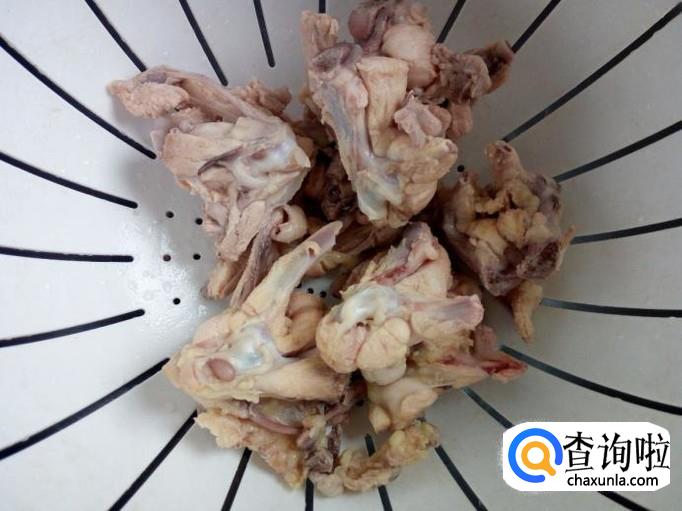把鸡叉放入冷水锅中烧开,水开后煮一分钟的时间捞出,用水冲洗干净(血水和沫子),沥干水分,备用。