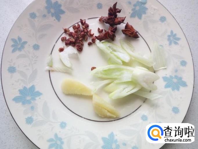 切好葱,姜,准备好花椒,八角,备用。