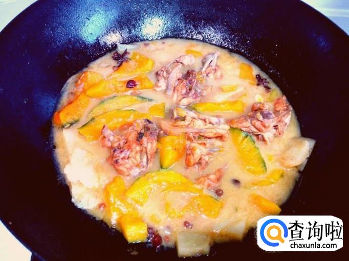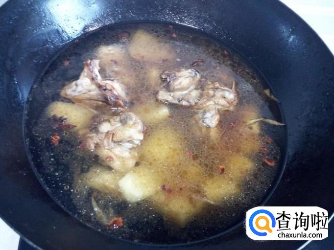 土豆翻炒至一分钟的时间,锅内放入水,水没过鸡叉和土豆,放入盐,大火烧开转小火慢炖。炖至十分钟的时间,放入南瓜转大火烧开,再转小火慢炖。