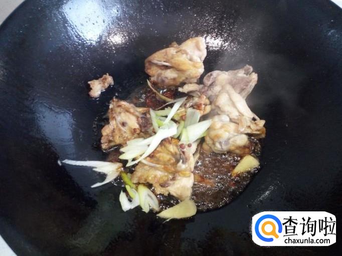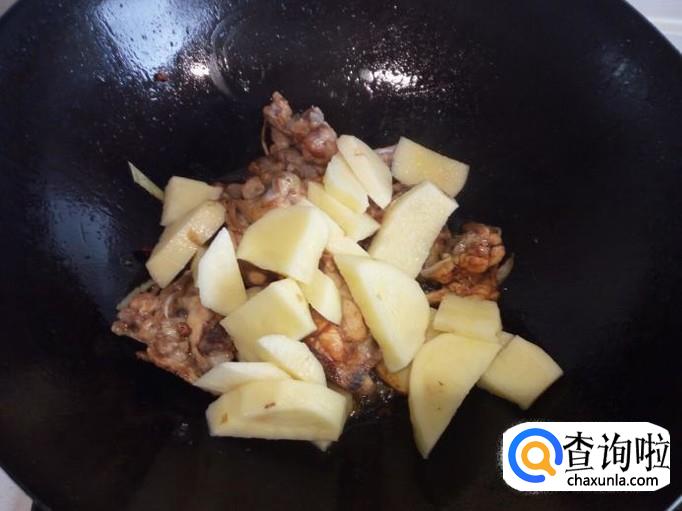 炒至鸡叉下油后,放入花椒,八角,葱,姜,翻炒,放入料酒,酱油。然后放入土豆翻炒。