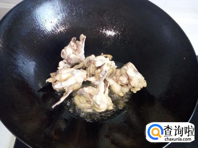 锅内放入油加热,油热后放入鸡叉翻炒。