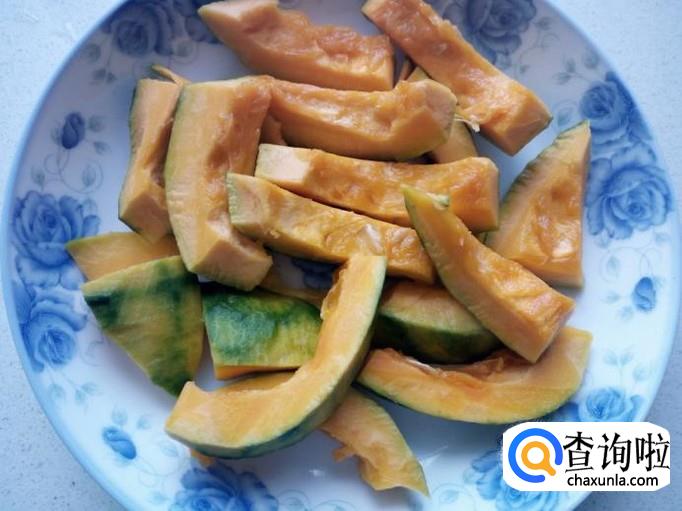南瓜去除瓜皮,瓜瓤,瓜子,用水清洗干净,控干水分,切成块。
