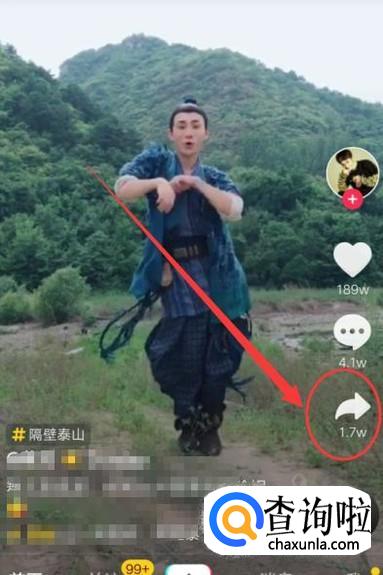 进入抖音之后,找到自己想要合拍的视频,点击图示位置的按键,如图所示。