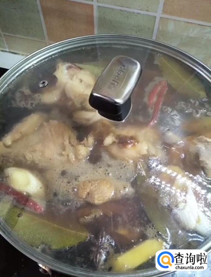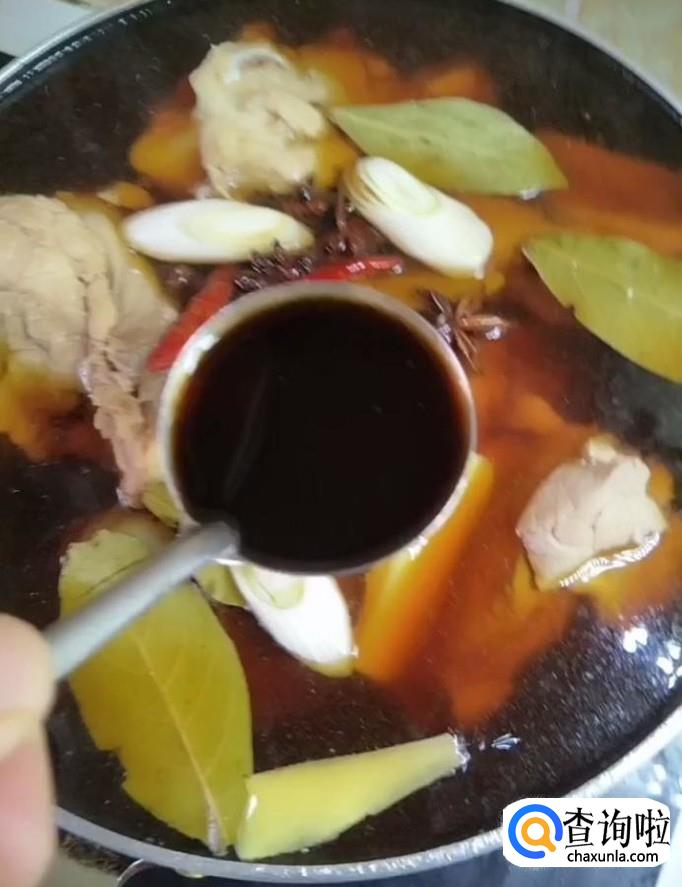接着我们放入适量的酱油,蚝油,老抽,盐,鸡精,十三香,盖上锅盖,大火烧开以后转小火,炖1个小时