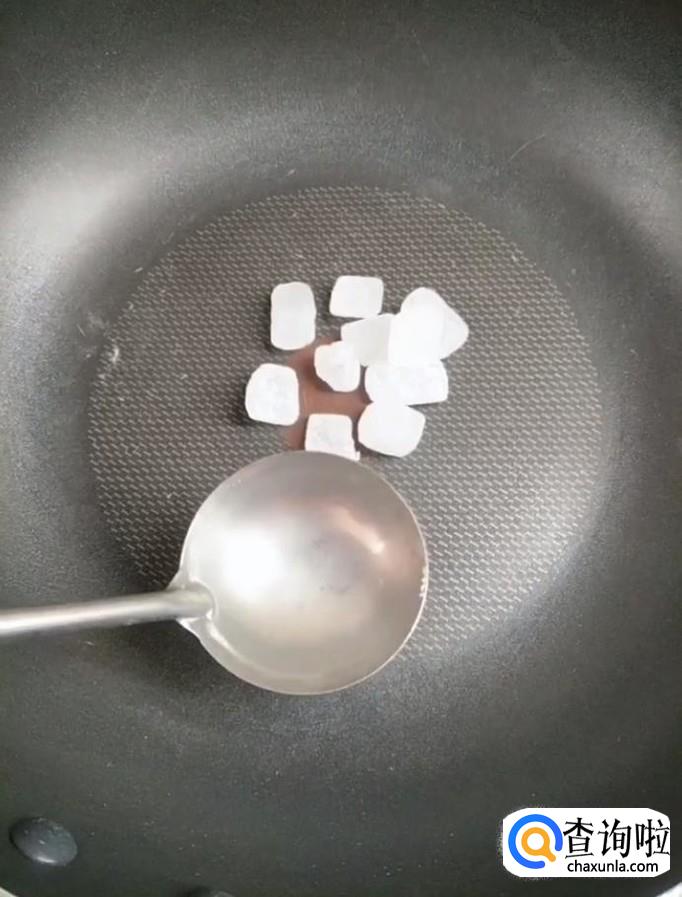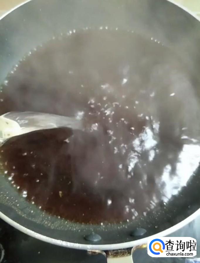 接着,我们在一个干净的锅中,加入适量的冰糖,少许水,熬至焦糖色倒入开水