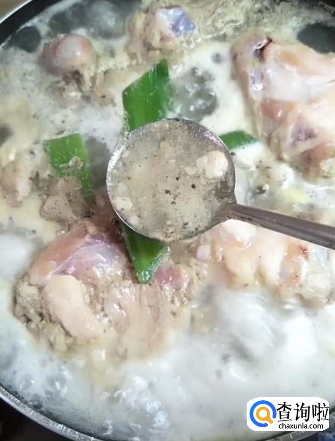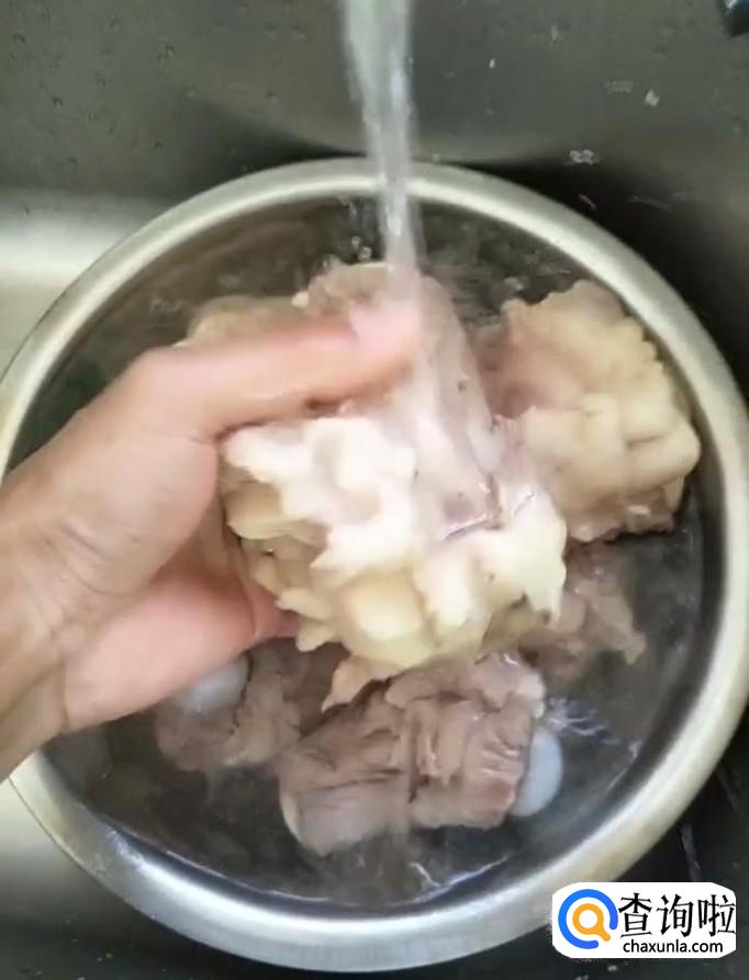 然后我们在锅中放入水,放入大骨头,加入葱姜,料酒,煮出血沫,煮好以后捞出来在凉水里面清洗干净,控干水分备用