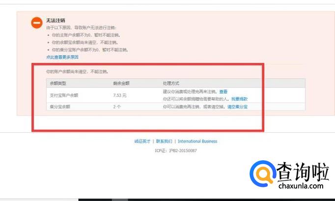 在进入下一个页面之后,提示账户无法注销,账户中还存在一些原因无法注销,然后按着这些条文去清除这些因素,再按着上述步骤操作即可注销支付宝账户,如图所示。