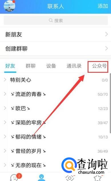 打开手机QQ,进入手机QQ主页面,点击右侧的“公众号”,进入下一界面,如图所示。