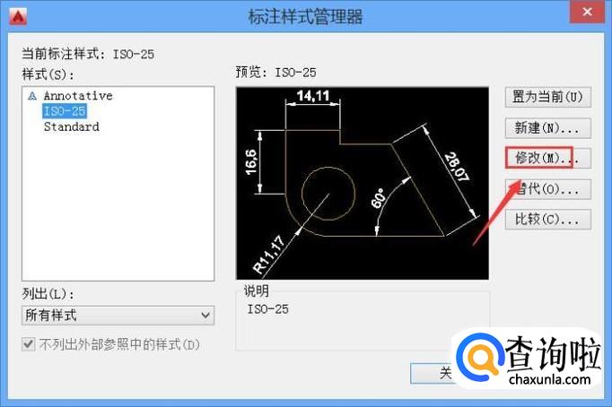 点击标注样式选项,在弹出的对话框内找到修改选项,如图所示: